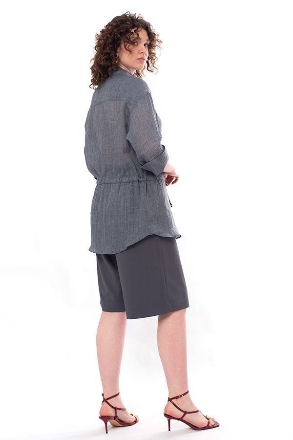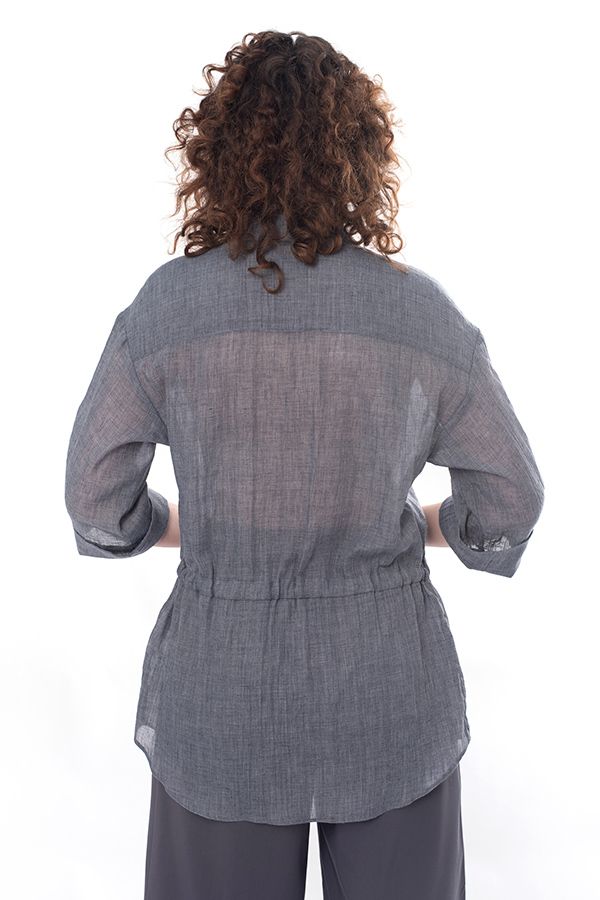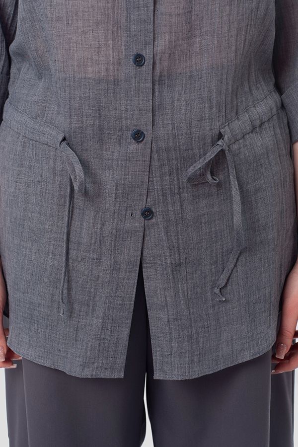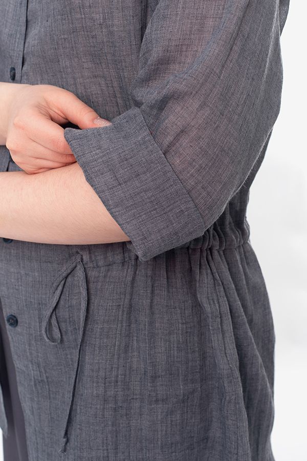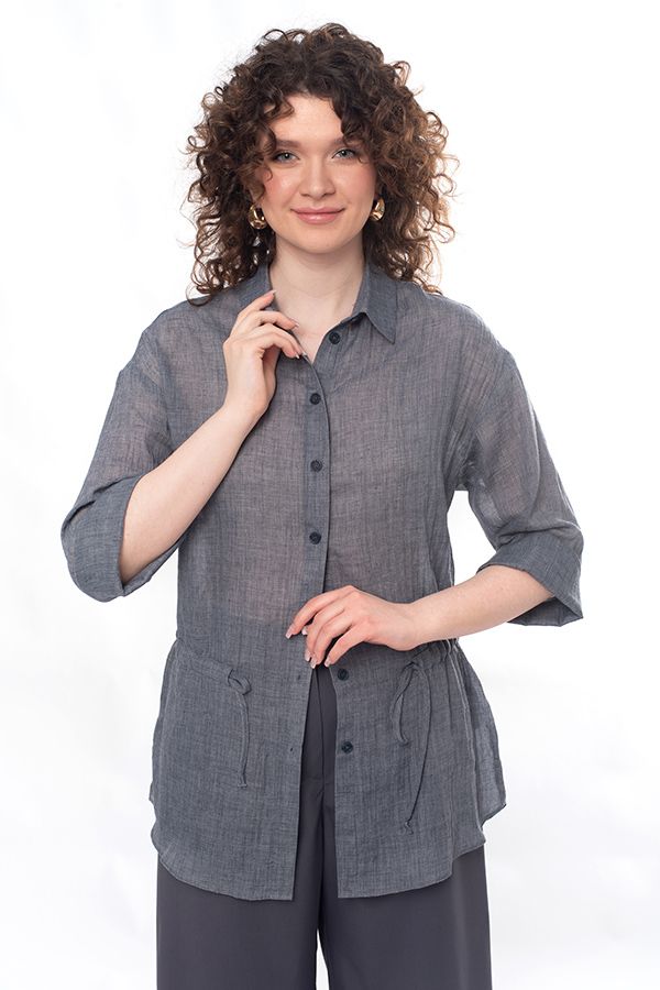 Стильная рубашка-пыльник свободного силуэта. Застежка на пуговицы, на поясе кулиска, по боковым швам разрезы. По спинке кокетка. Рукав 38 см в расправленном виде, с возможностью подворота. Длина по спинке 77 см. Размер модели на фото: 44. Параметры модели: 86-66-96. Рост модели на фото: 175 см.