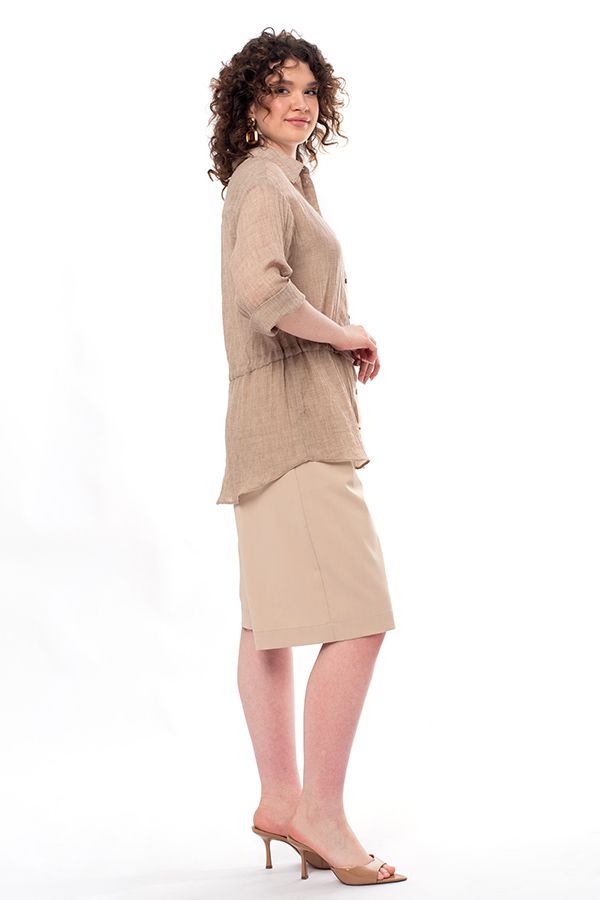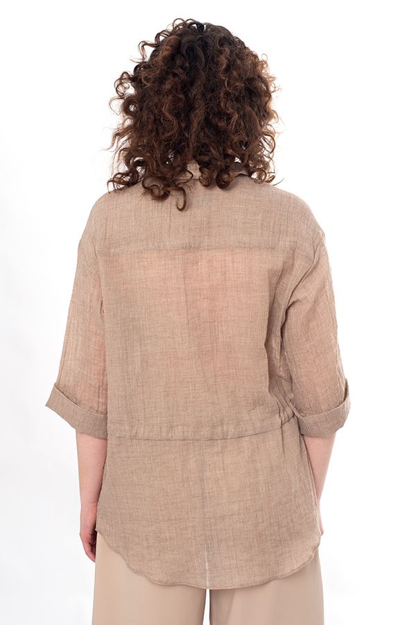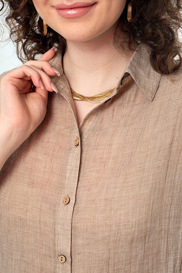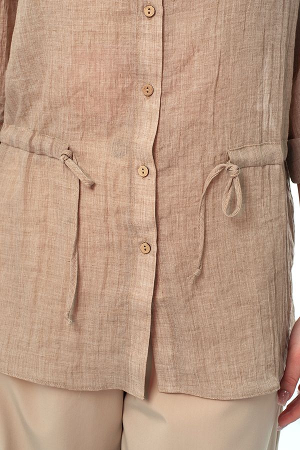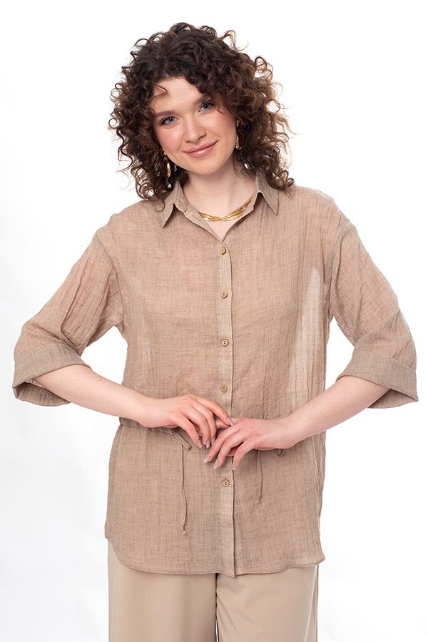 Стильная рубашка-пыльник свободного силуэта. Застежка на пуговицы, на поясе кулиска, по боковым швам разрезы. По спинке кокетка. Рукав 38 см в расправленном виде, с возможностью подворота. Длина по спинке 77 см. Размер модели на фото: 44. Параметры модели: 86-66-96. Рост модели на фото: 175 см.