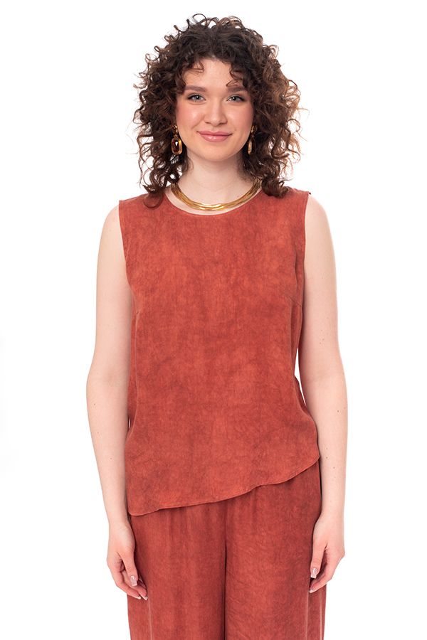 Топ из 100% вискозы. Асимметричный низ, вытачки Длина по спинке: 58 см. *Числовые параметры соответствуют размеру 44. Размер модели на фото: 44. Параметры модели: 86-66-96. Рост модели на фото: 175 см.