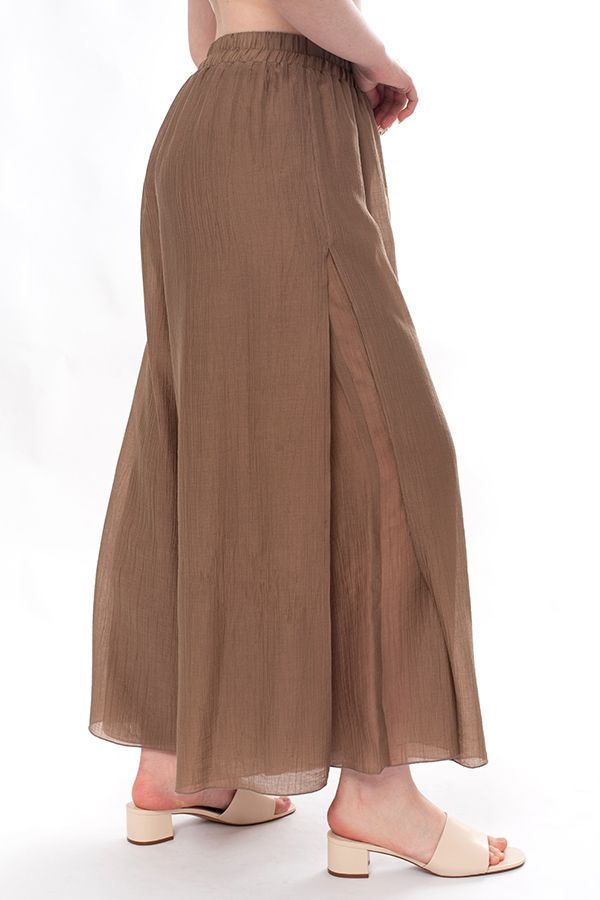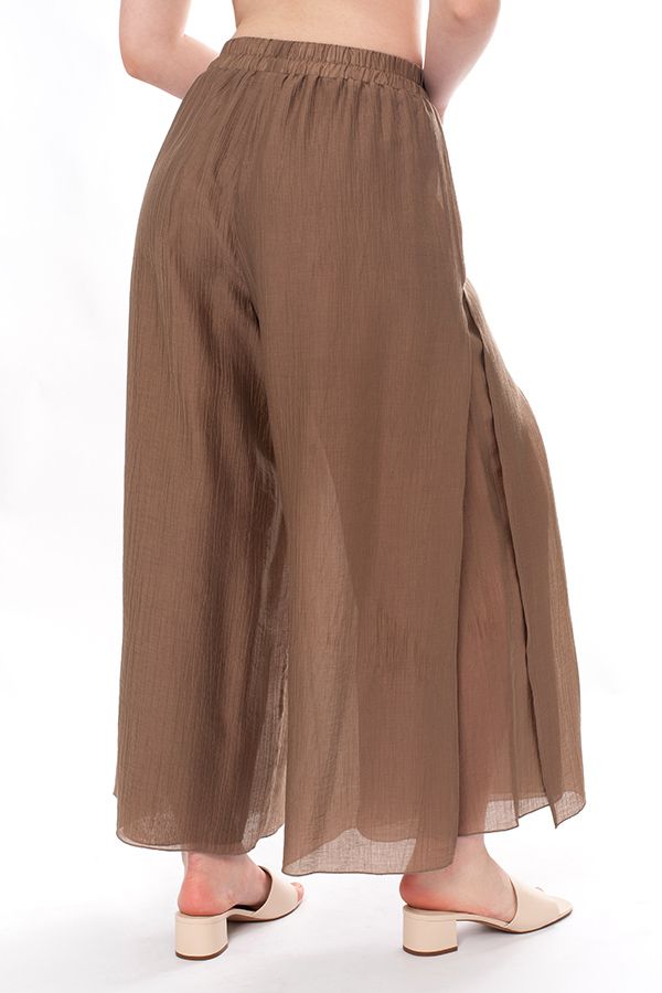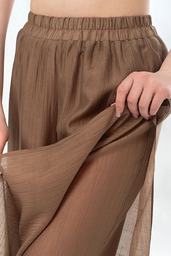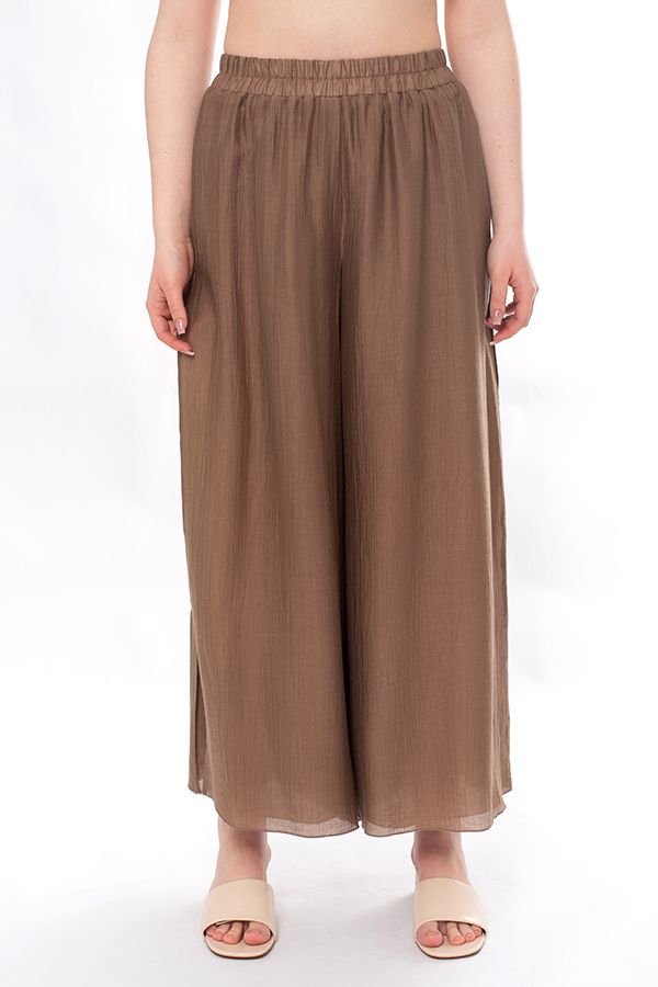 Воздушные двойные брюки из легкой ткани с большим содержанием тенсела. Детали: в поясе резина, верхний слой брюк с разрезом 28 см. в боковом шве (от пояса). Длина по внутреннему шву - 67,5 см. Ширина по линии низа: 42 см. *Числовые параметры соответствуют размеру 44-46. Размер модели на фото: 44-46. Параметры модели: 86-66-96. Рост модели на фото: 175 см. Внимание! Размеры сдвоенные: 44-46, 48-50, 52-54.