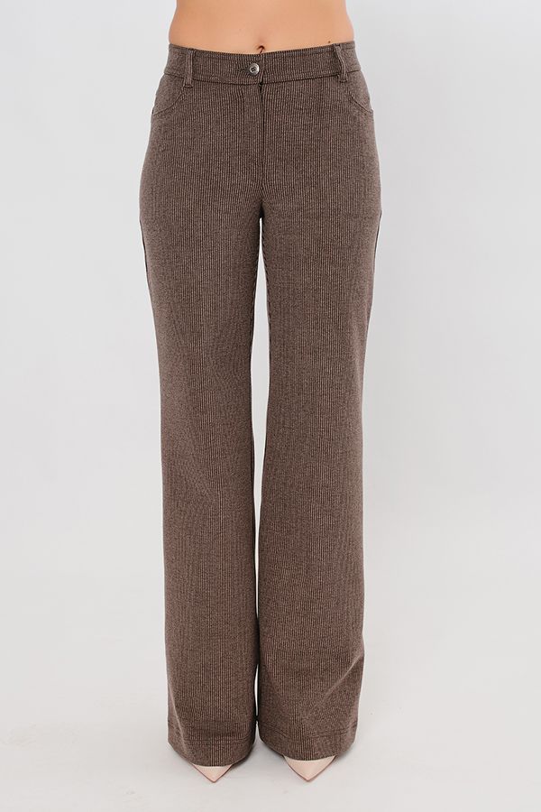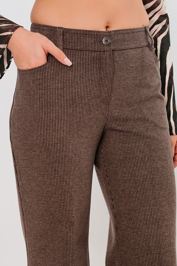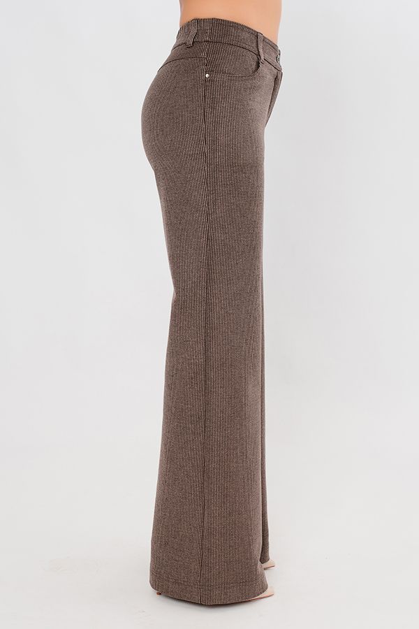 Современные брюки из теплого трикотажного полотна под "вельвет". Модный силуэт-клеш от середины бедра. Детали: спереди застежка на молнию и пуговицу, карманы с горизонтальным входом оформлены хольнитенами. Фигурный пояс со шлевками, по спинке пояса резина на сборке. Длина по внутреннему шву-87 см. Ширина низа- 29,5 см. "числовые параметры соответствуют размеру 44. размер модели на фото 44. Параметры модели: 86-63-94. Рост модели на фото: 173 см.