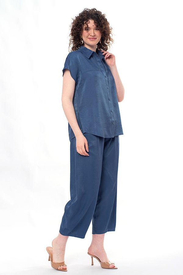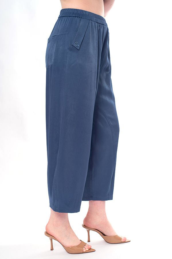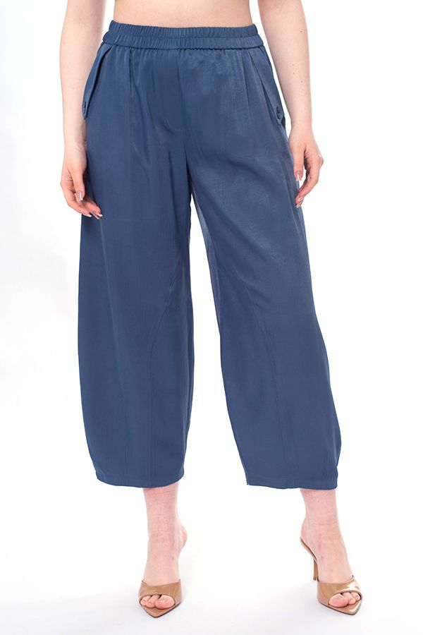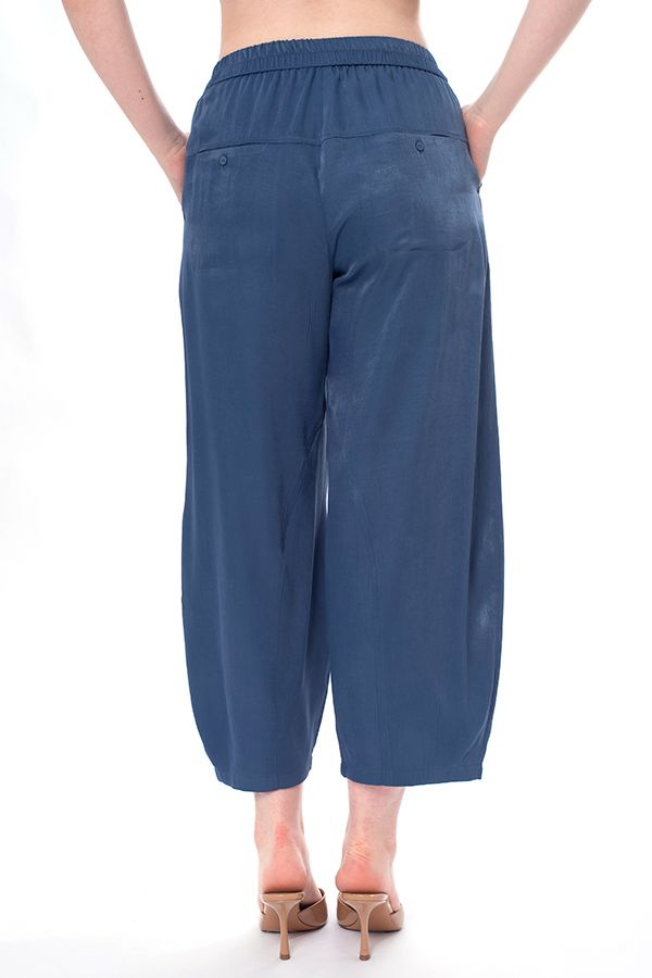 Брюки свободного кроя, близкие по силуэту к брюкам "алладин", из легкой вискозной летней ткани. Детали: спереди имитация гульфика, боковые карманы с отрезным бочком, с оригинальным отлетным клапаном и пуговицей. Сзади под кокеткой прорезные карманы на пуговице. В поясе резина. По передней и задней половинке брюк фигурные резы, по низу вытачки. Длина по внутреннему шву-68 см. Ширина по линии низа - 22 см. *Числовые параметры соответствуют размеру 46. Размер модели на фото: 46. Параметры модели: 86-66-96. Рост модели на фото: 175 см.