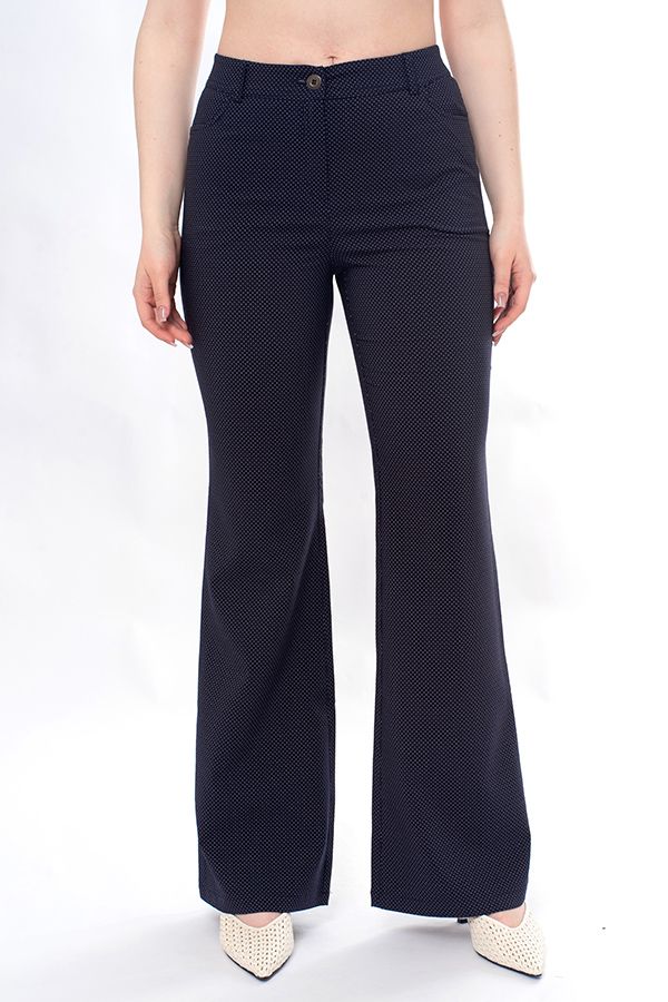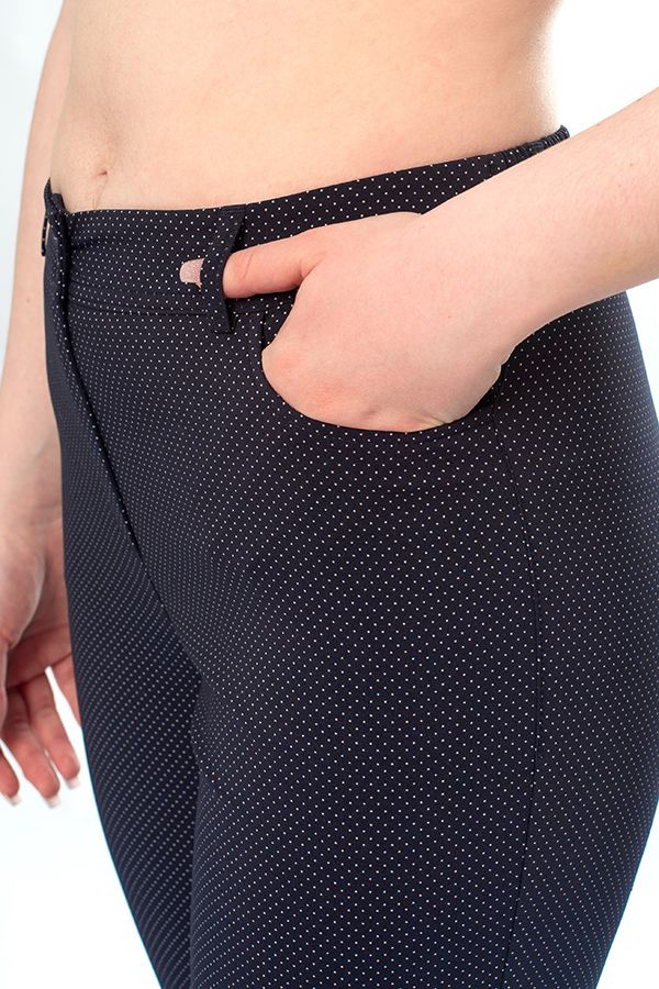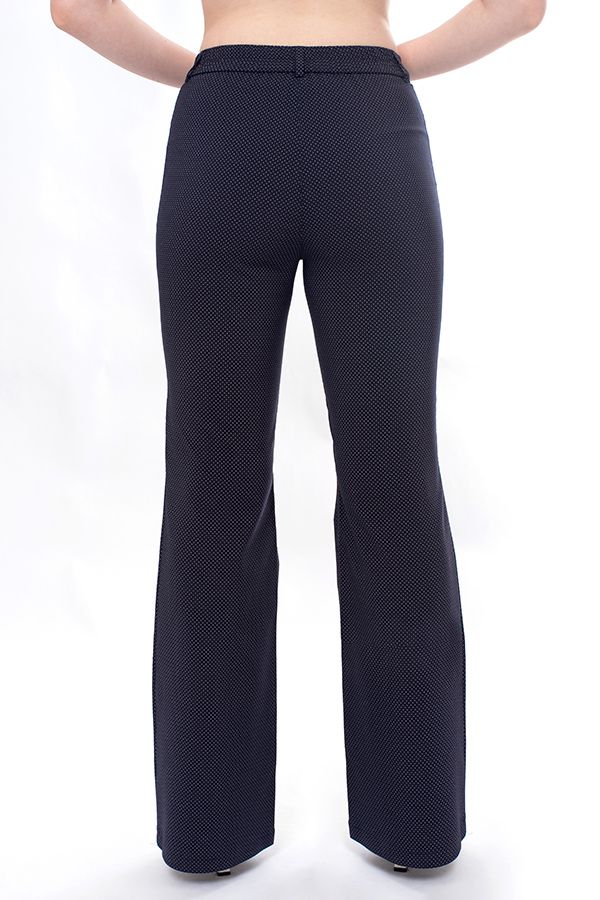 Модель брюк в полную длину, с небольшим клешем от колена. Детали: спереди застежка на молнию и пуговицу, боковые карманы с горизонтальным входом. Сзади в поясе резина на сборке, шлевки на поясе. Длина по внутреннему шву - 84 см. Ширина низа - 27,5 см. Числовые параметры соответствуют размеру 44. Размер модели на фото: 46. Параметры модели: 86-66-96. Рост модели на фото: 175 см.