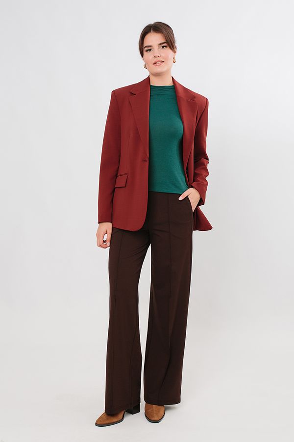 Элегантная модель брюк из гладкого трикотажа. Детали: простроченные стрелки, карманы с отрезным бочком, с отделкой. В поясе плотная резина на сборке. Длина по внутреннему шву - 81 см. Ширина низа - 28,5 см. Числовые параметры соответствуют размеру 44. Размер модели на фото: 44. Параметры модели: 86-63-94. Рост модели на фото: 173 см.