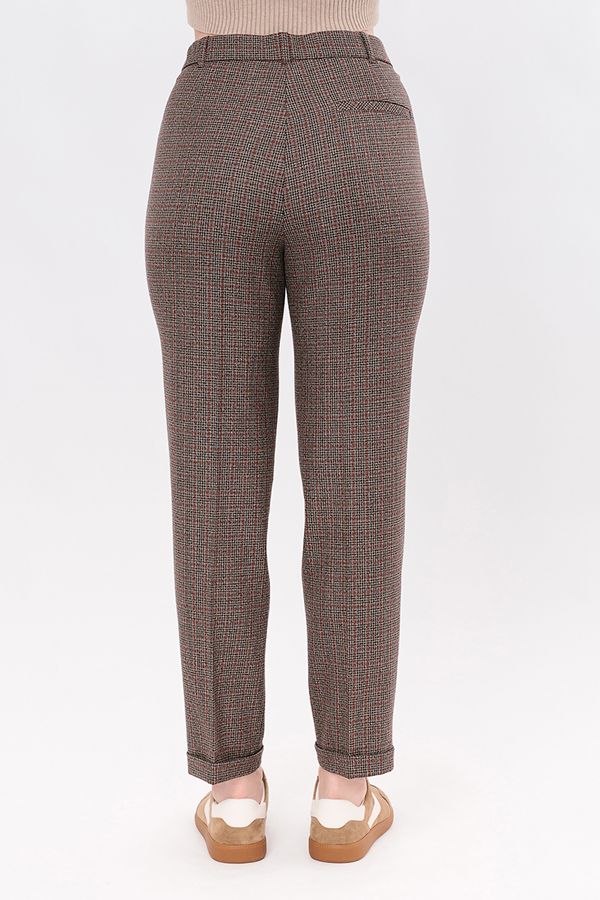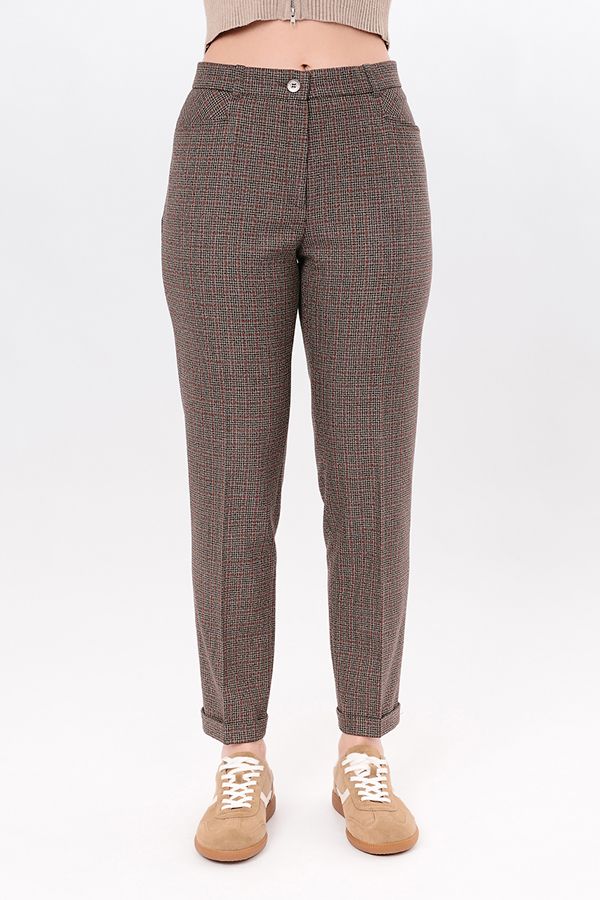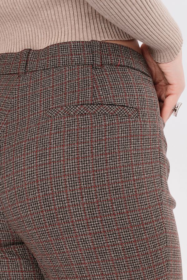 Модель в классическом стиле со стрелками. Детали: спереди застежка на молнию и пуговицу, боковые карманы с горизонтальным входом, сзади под вытачками справа листочка с имитацией кармана. В пояс вставлена эластичная лента. По линии низа отворот, который можно использовать для изменения длины брюк. Длина по внутреннему шву - 73 см. Ширина низа - 17,5 см. Числовые параметры соответствуют размеру 44. Размер модели на фото: 46. Параметры модели: 90-64-97. Рост модели на фото: 175 см.