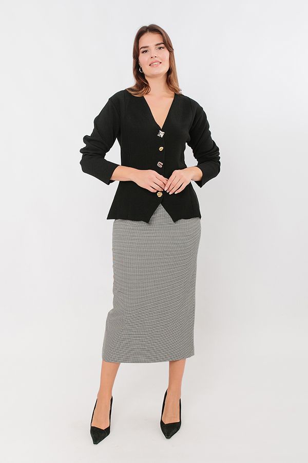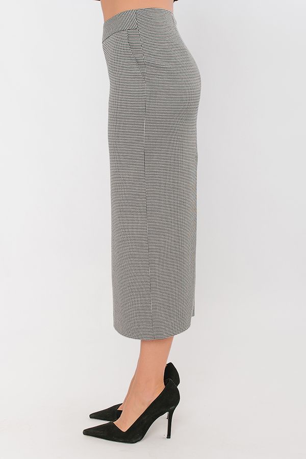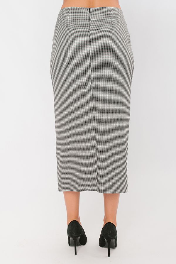 Элегантная модель прямой юбки-миди. Юбка на подкладке, попередный половинке фигурный пояс-кокетка, боковые карманы. По задней половинке вытачки, застежка на потайную молнию в среднем шве, щлица. Длина изделия 83 см. Размер модели на фото: 44. Параметры модели: 86-63-94. Рост модели на фото: 173 см.